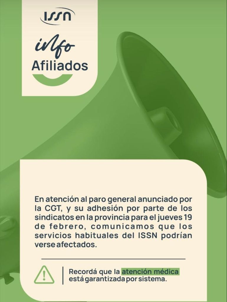 Sin embargo, llevó tranquilidad respecto del servicio esencial. “Recordá que la atención médica está garantizada por sistema”, indicaron desde el ISSN.