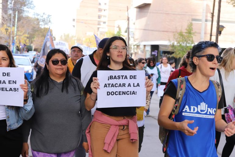 Los docentes nucleados en ATEN llevan adelante este jueves un paro por 24 horas en repudio a la violencia que sufrió el equipo directivo del IFD 12 del nivel primario por parte de la familia de una estudiante. Marcharon por el centro de la ciudad y concluyeron en un acto en la puerta del colegio donde sucedió la agresión para reclamar al Gobierno provincial "seguridad" para estudiantes y docentes.