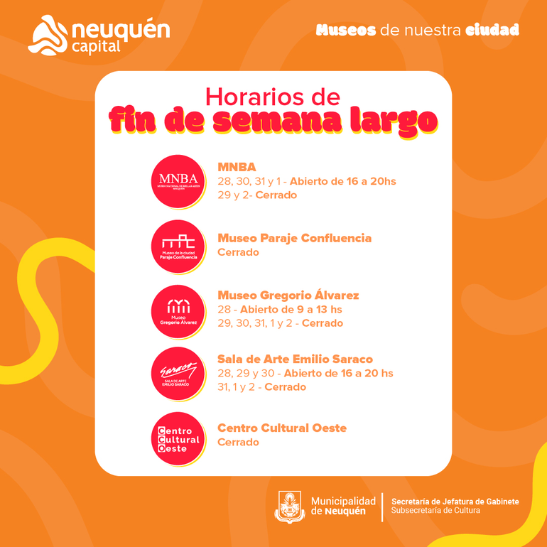 Este fin de semana extra largo también se podrá disfrutar de muestras en los museos de la ciudad y en la Sala de Arte Emilio Saraco, con entrada libre y gratuita. Los horarios de apertura se pueden encontrar en las redes sociales de la Municipalidad.