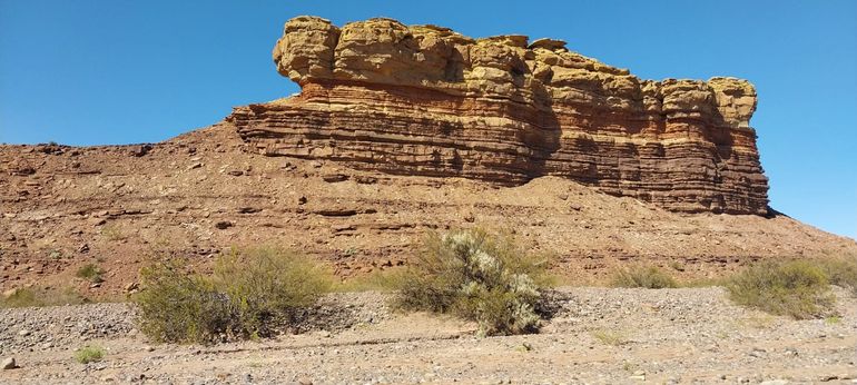 Kilómetros más tarde y ya con las primeras vistas del río Neuquén, Juan toma una curva y nos invita a prepararnos. De pronto, una imponente barda rocosa nos da la bienvenida con una explosión de rojos y amarillos tallados por el rugir del viento. De fondo, las aguas turbias del Neuquén danzan con calma hacia el este rodeadas de arenales. Otras cautivantes formaciones rocosas contrastan con un valle salpicado con sauces y alamedas revividas por la flamante primavera. Llegamos a Paso de los Indios.