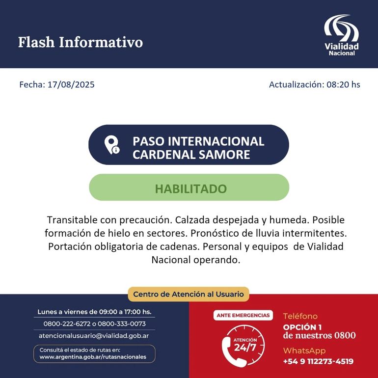 Por su parte, el paso internacional Cardenal Samoré se encuentra transitable con precaución. "Calzada despejada y húmeda. Posible formación de hielo en sectores. Pronóstico de lluvias intermitentes. Portación obligatoria de cadenas. Personal y equipos de Vialidad Nacional operando", expresa el comunicado.