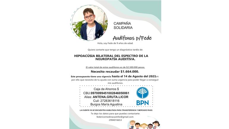 El pequeño necesita el dinero antes del 14 de agosto porque hasta esa fecha le mantienen el presupuesto de $2.300.000 en la ortopedia para adquirir los audífonos. Como la obra social les cubre un monto fijo de $636.000, restaría reunir el resto.