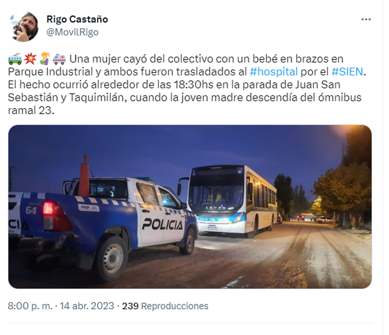 Presa del temor, lo primero que hizo la mujer fue proteger a su bebé con su cuerpo recibiendo todo el golpe. Los demás pasajeros que iban en el colectivo, así como también el conductor, descendieron para ayudarla, mientras esperaban el arribo de una ambulancia del Sistema Integrado de Emergencias de Neuquén (SIEN).