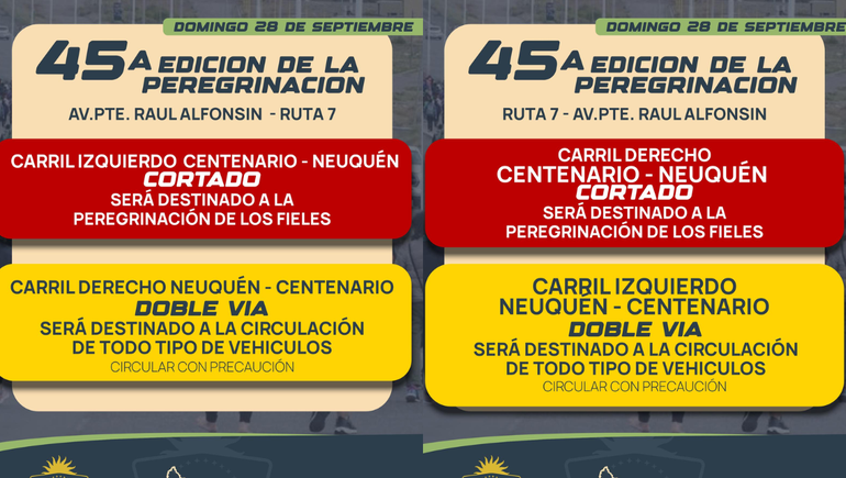 De igual manera, el carril derecho Centenario-Neuquén permanecerá cortado y destinado a los fieles.