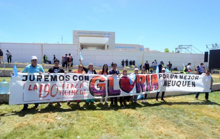 Además de la comitiva de Plottier, compuesta por el intendente Luis Bertolini, y sus funcionarios, la vicegobernadora tenía un grupo de simpatizantes provenientes de Plaza Huincul que llevaron una imponente bandera con su nombre. "La amamos a Gloria", gritaban con emoción.