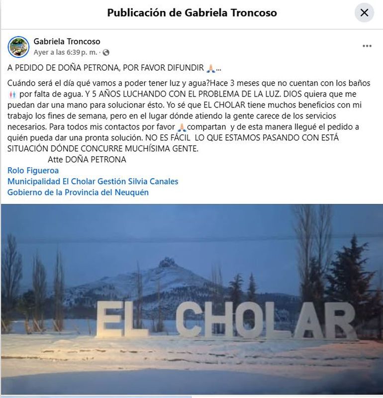 "Doña Petrona", la sanadora del norte neuquino por la que cientos de personas viajan todos los días hasta El Cholar para pedir su ayuda, salió este domingo a pedir asistencia porque está cansada de vivir sin agua y si luz. La mujer le pidió a su amiga Gabriela Troncoso que haga el pedido por redes sociales y el posteo ya lo compartieron casi 3 mil personas.