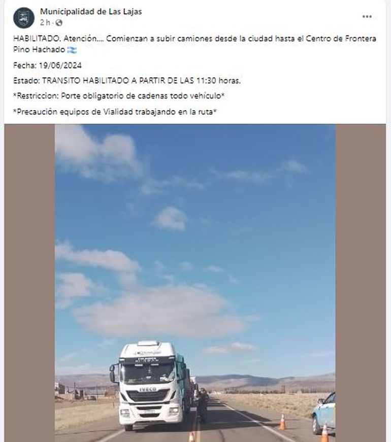 Cerca del mediodía de este miércoles, desde Vialidad Provincial confirmaron la apertura del paso fronterizo Pino Hachado para dejar pasar algunos camiones. Sin embargo, hay sectores con hielo y viento blanco, por lo que el tránsito está habilitado con precaución. La portación de cadenas es obligatoria y hay equipos operando.