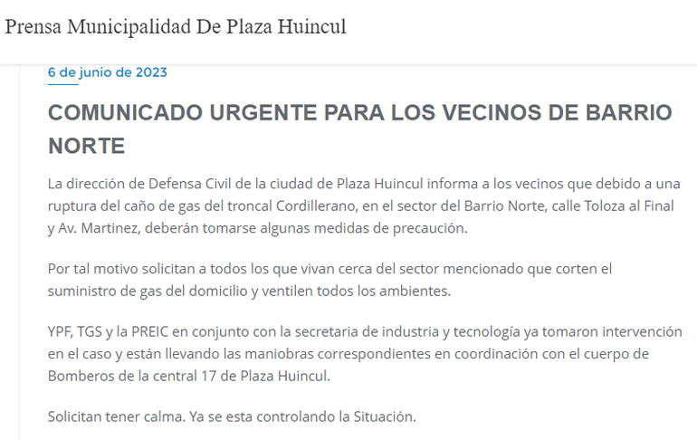 Desde el municipio de Plaza Huincul se emitió un comunicado en el que indicaron que se trataba de "una ruptura del caño de gas del troncal Cordillerano, en el sector de barrio Norte".