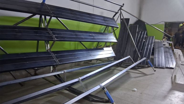 La estructura metálica colapsó y como consecuencia parte del público que estaba allí sentado resultó herido. Según confirmaron a LM Neuquén, se trata de al menos cuatro personas adultas lesionadas.