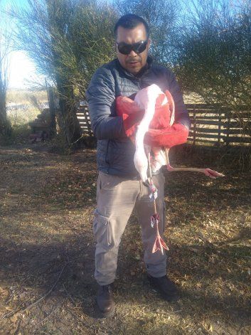 Un flamenco de imponente pelaje rosado fue rescatado por una pareja que vio al animal colgado de una de sus patas a un alambrado. Todo ocurrió este viernes en los alrededores del barrio Las Lilas de Plottier.