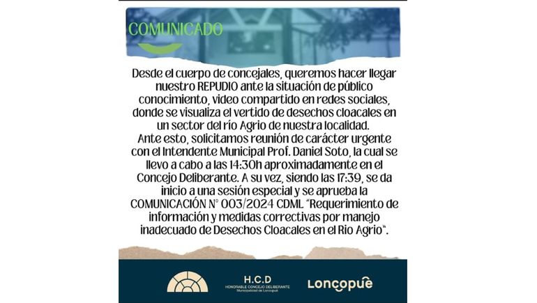El cuerpo del Concejo Deliberante local emitió este jueves un pedido de informe al Ejecutivo para que de a conocer, dentro de las próximas 24 horas, sobre el presunto vertido de desechos cloacales en el río por parte de un camión de riego municipal.