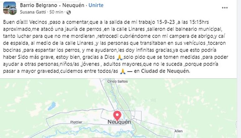 Todo ocurrió alrededor de las 15:15 del viernes. Ella iba a su casa y vio que los perros cruzaban la calle Linares de una punta a la otra. "Primero me atacó uno negro con chaleco verde flúor. Luego se sumó otro grandote. Yo empecé a retroceder. Se sumaron otros más. Eran como cinco. Seguí retrocediendo, mientras me defendía con una campera. Uno se paró en dos patas y tiró mordiscones. Me llegaba a la altura de mi cara. No había forma de pararlos. Al final me caí en el medio de la calle y casi me pisan. Algunos automovilistas pararon y tocaron bocinazos para espantarlos. Gracias a ellos, los perros se alejaron. Yo no podía ni respirar de la desesperación. Un matrimonio me trajo hasta Copahue y Linares, donde vivo", relató la mujer.