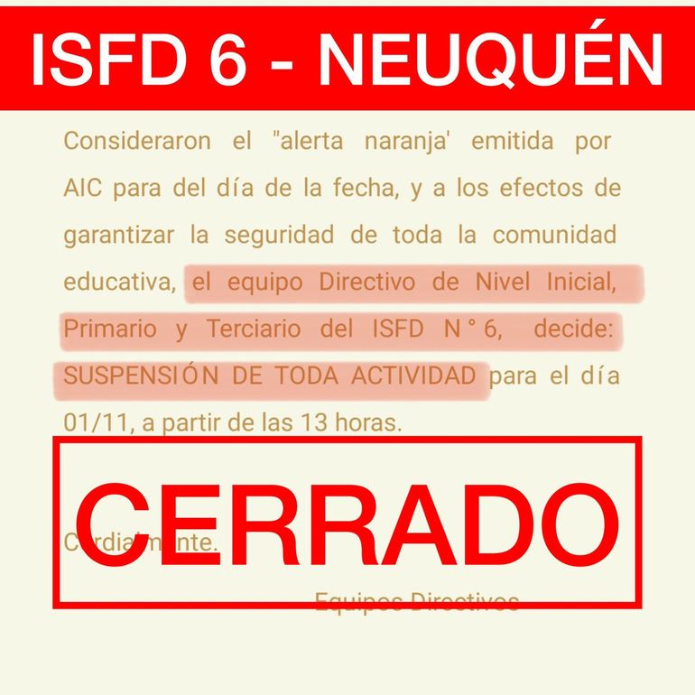 El Ministerio de Gobierno y Educación y el Consejo Provincial de Educación (CPE), informaron en un comunicado de prensa que ante las inclemencias climáticas que afectan a distintas localidades y a la zona Confluencia de la provincia del Neuquén, las instituciones educativas, en articulación con los equipos de supervisiones y Distritos Escolares, evaluarán de manera situada, según sea su realidad, la suspensión de actividades escolares, si así lo requieren.