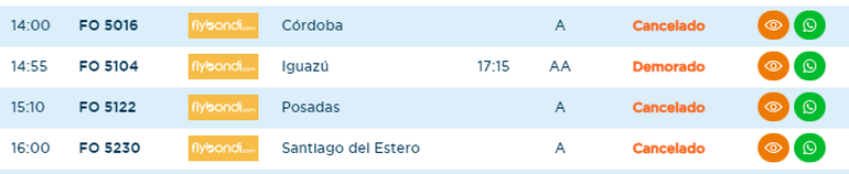 De acuerdo a la información brindada por Aeropuertos Argentina 2000, el vuelo FO 5300 que partía desde Buenos Aires hacia el aeropuerto Presidente Perón fue cancelado. Lo mismo ocurría con el programado (FO 5301) desde Neuquén.