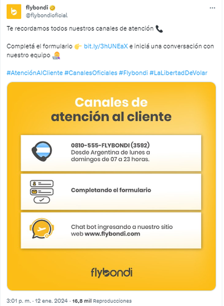 En el comunicado, la low cost Flybondi manifestó que “mantiene contacto con las autoridades gubernamentales y manifestó su preocupación ante esta situación, advirtiendo la necesaria regularización, buscando que no se replique con otros proveedores que son esenciales para la operación aérea y que se encuentran en una situación similar por la falta de pago”.