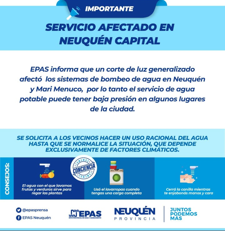 El Ente Provincial De Agua y Saneamiento (EPAS) informó que un corte de luz generalizado afectó los sistemas de bombeo de agua en Neuquén y Mari Menuco. Por ese motivo, en algunos sectores de la ciudad el servicio de agua puede tener baja presión.