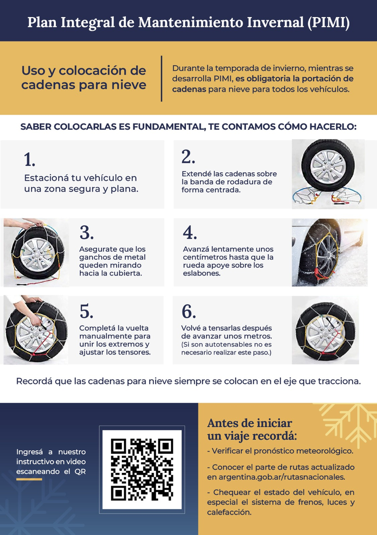 Ante esto, se recordó que durante la temporada invernal es obligatorio portar y utilizar cadenas para nieve en todos los vehículos que circulen por rutas en zonas de montaña. Esta disposición tiene como objetivo evitar accidentes por deslizamientos o pérdida de control al conducir sobre superficies resbaladizas.