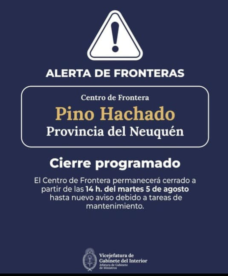 El Paso Fronterizo Pino Hachado, uno de los principales pasos internacionales que conectan la provincia de Neuquén con Chile, permanecerá cerrado hasta nuevo aviso a partir de este martes a las 14. Así lo informaron las autoridades de la Vicejefatura de Gabinete del Interior.