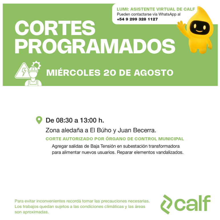 La Cooperativa CALF anunció que este miércoles 20 de agosto se realizarán cortes programados de energía en un sector de la ciudad de Neuquén, debido a trabajos técnicos en la red de distribución. La interrupción del servicio afectará a usuarios de la zona aledaña a El Búho y Juan Becerra, desde las 8:30 hasta las 13:00 horas.