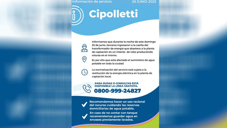 En tanto, Luis Arguello, a cargo de la regional de ARSA en Cipolletti señaló que el “horas del mediodía se estaría poniendo en funcionamiento para comenzar a abastecer nuevamente la ciudad con agua” (la normalización del servicio podría demorar algunas horas más). Por el momento, en esa planta no hay energía eléctrica.
