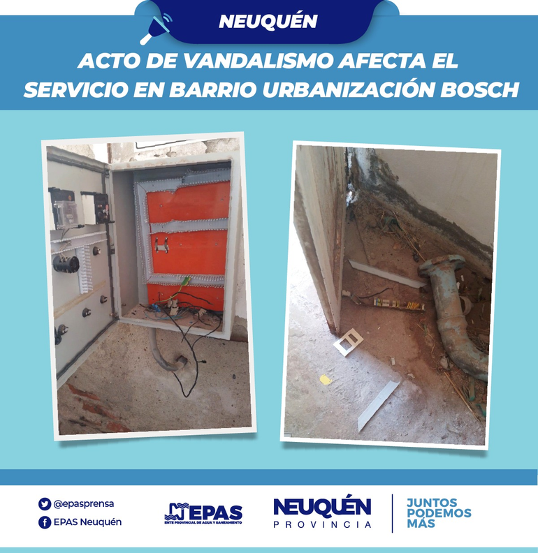 Un acto de vandalismo en el Barrio Urbanización Bosch afectó el pozo de bombeo de agua potable que abastece esa zona. Según informaron desde el Ente Provincial de Agua y Saneamiento (EPAS), el hecho ocurrió en la madrugada de este viernes.