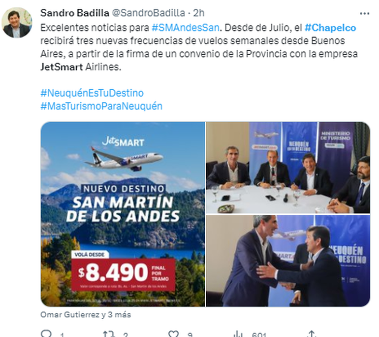 En tanto, el ministro Badilla expresó que “es un día muy especial, de mucha alegría, poder concretar estas gestiones que por impulso del gobernador de la provincia y con la activa participación tanto del intendente de San Martín de los Andes, Saloniti y del secretario de Turismo, Apaolaza, nos permitieron, en conjunto con la empresa JetSMART, poder concretar algo largamente anhelado que es poder seguir incrementando las frecuencias y el movimiento del aeropuerto Chapelco, pero además la presencia de una nueva línea aérea que viene creciendo en cantidad de pasajeros y frecuencias, que ha pasado una temporada estival e invernal extraordinaria y una temporada invernal con números récord en nuestra provincia”.