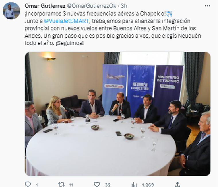 "Gracias a la empresa JetSMART que analizó y aprobó la ruta para volar al destino. Hoy podemos concretar un trabajo que se viene realizando hace muchísimo tiempo junto al sector privado, a NeuquénTur y el Ministerio de Turismo de la Provincia del Neuquén. Un trabajo que hace que hoy podamos estar anunciando en principio estas tres frecuencias que se van a concretar a partir del día 3 de julio".