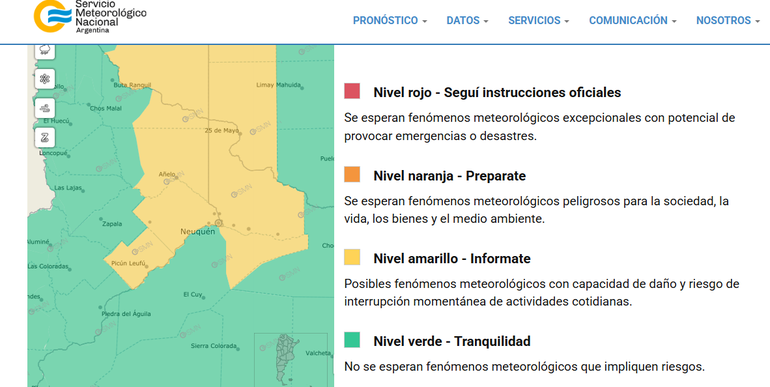 El pronóstico del organismo nacional para este miércoles indicaba que continuaba la alerta amarilla por tormenta. Las zonas que quedaron bajo la alerta son Confluencia, este de Añelo, este de Pehuenches y Picún Leufú.
