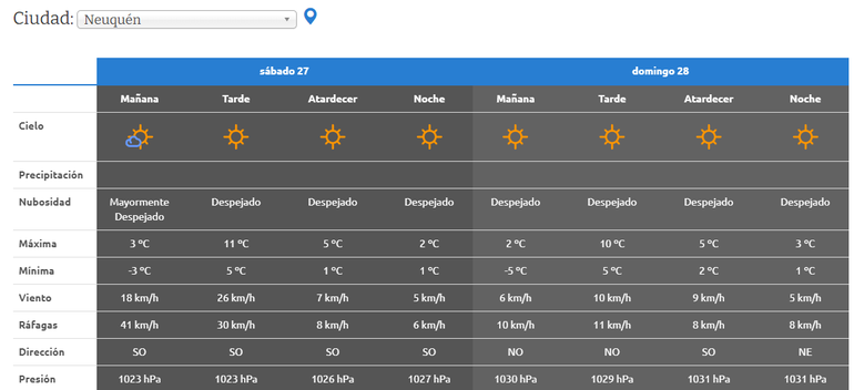 En la capital neuquina también se harán sentir con fuerza el frío con heladas por la mañana. Este sábado hubo una mínima registrada en torno a los -4 grados centígrados, y aunque estará soleado toda la jornada, la máxima será de 12 grados centígrados. El viento no será una molestia.