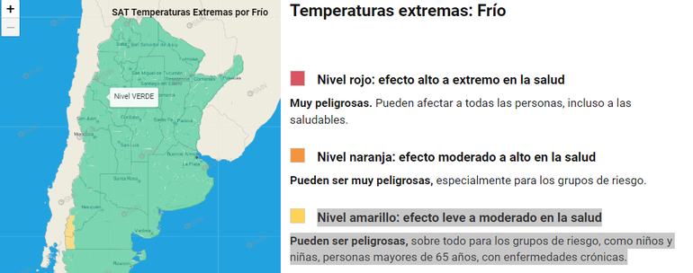 Por frío, el Servicio Meteorológico Nacional advierte que una parte de la provincia registrará temperaturas extremas nivel amarillo, con efecto leve a moderado en la salud. Es decir, pueden ser peligrosas, sobre todo para los grupos de riesgo, como niños y niñas, personas mayores de 65 años, con enfermedades crónicas. En el mapa, señala a la Cordillera de Huiliches, Cordillera Lácar y Sur de Aluminé.