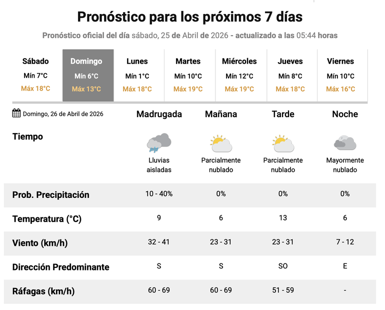 El viento del sudoeste ya soplará a 30 km/h con ráfagas de hasta 37 km/h durante el día, pero los más preocupante podría llegar a la noche, cuando baje el sol. Ahí el viento se intensificará a 45 km/h sostenidos con ráfagas de hasta 70 km/h, y el termómetro caerá a apenas 2°C.
