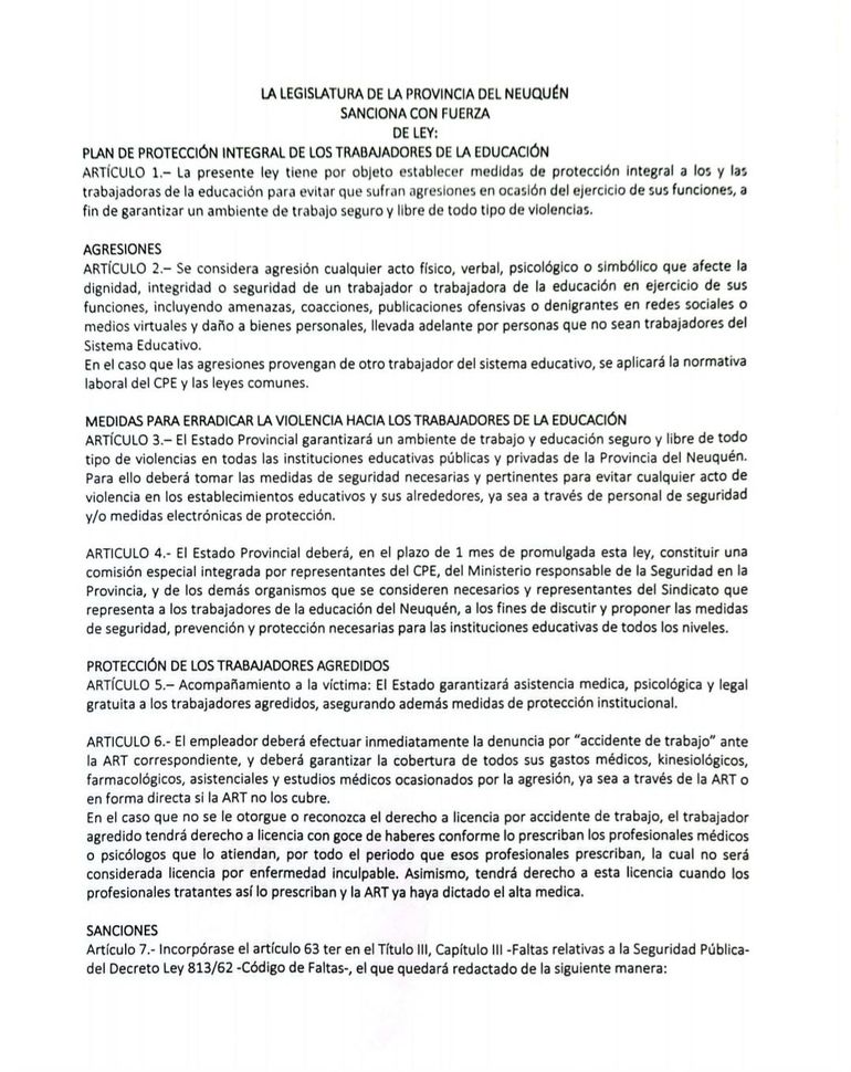 En 2024, tras la agresión de un padre a un directivo en una escuela de Plottier, Agustín Sánchez, asesor pedagógico de la EPET 27 y licenciado en Psicopedagogía y Gestión Educativa, ideó un proyecto de ley para crear un régimen contra la violencia hacia docentes y directivos.