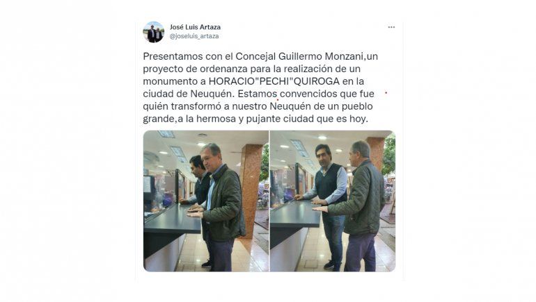 A tres años del fallecimiento del exintendente de la capital neuquina, Horacio “Pechi” Quiroga, los concejales José Luis Artaza y Guillermo Monzani presentaron un proyecto de ordenanza para emplazar un monumento en su honor, en reconocimiento por transformar a Neuquén en una pujante ciudad.