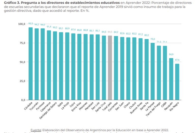 A nivel país, el informe indica que "el 84,5% de los directores que accedieron al reporte declaran que el mismo sirvió como insumo para la gestión educativa. A nivel provincial, Córdoba lidera con un 95,5% de los directores que accedieron consideran que el mismo ha servido como insumo, seguida por Tucumán con un 94,2%".
