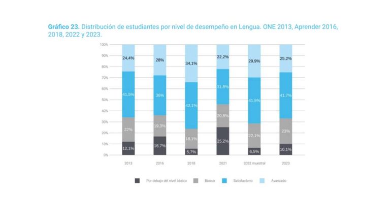 En lengua, los niveles también bajaron pero son superiores a los que se ven en matemática. De este modo, un 33,1% sólo tiene conocimientos básicos o no alcanza los saberes mínimos, lo que representa una suba con respecto al 2022, cuando el número era del 28%.