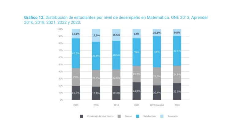 De esta forma, hoy un 48,1% de los estudiantes no tiene niveles de satisfactorios de matemática, cuando esta cifra alcanzaba al 45,9% el año pasado. La caída también se nota más en el nivel avanzado: los alumnos destacados en matemática pasaron de ser el 17% en 2017 a apenas el 9,8% en 2023. Vale tener en cuenta que el nivel avanzado representa que el estudiante sabe todos los contenidos esperados para su año escolar, mientras que el resto implican saberes por debajo del total de la currícula.