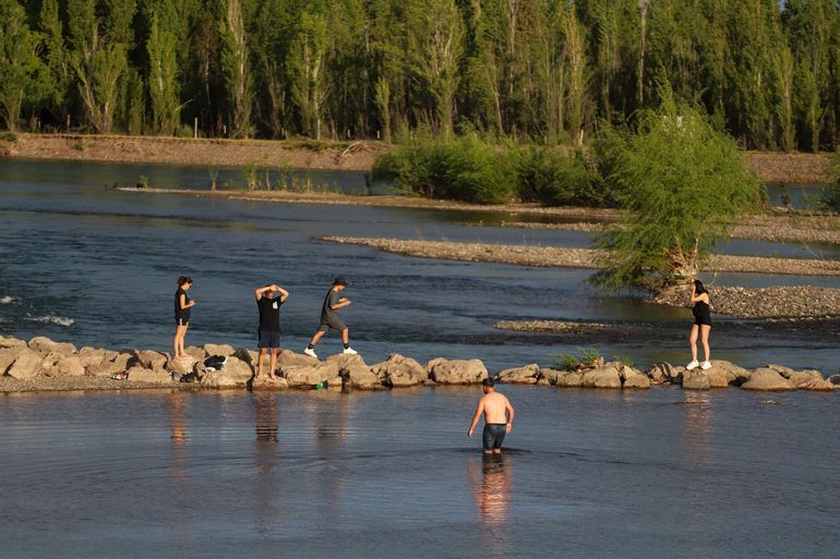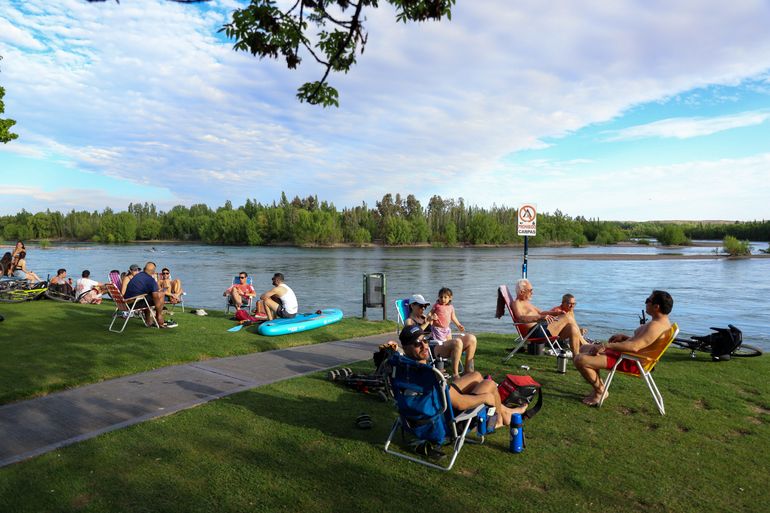 Pero todavía no llega el viento y el calor de la tarde fue un imponderable para mucha gente que buscó tomar sol, compartir mates y hasta zambullirse en las todavía frías aguas del río Limay.