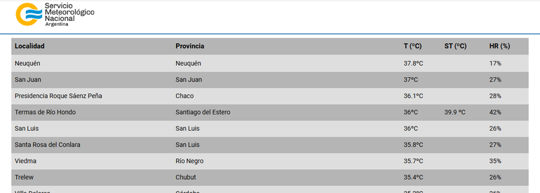A las 17 horas, el registro marcaba 37,8°C y Neuquén estaba por encima de todas las capitales del país. En el recorte de las 18, con una leve baja en la temperatura, Neuquén bajó algunos lugares y se ubicó tercero con 37º grados.