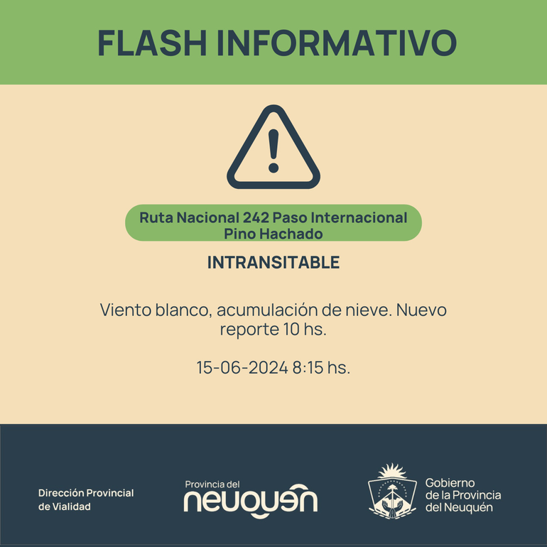 Según el reporte de Vialidad Provincial, a las 8 de la mañana, la ruta provincial 13 se encontraba intransitable en la zona de Primeros Pinos por viento blanco. En tanto, que la Ruta Nacional 242, en el paso internacional Pino Hachado, estaba intransitable y cerrado por acumulación de nieve y viento.