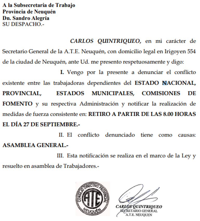 La medida gremial anunciada por ATE también incluye a UPCN y fue comunicada por las representaciones formalmente ante la Subsecretaría de Trabajo. Encuadra como asamblea general para darle protección a sus afiliados frente al retiro masivo que se espera a partir de las 8 de este miércoles.
