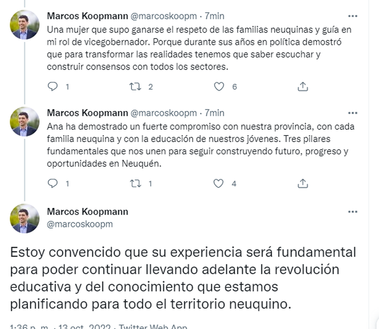 "Gracias Ana por aceptar acompañarme en este camino. Juntos, en equipo, vamos a seguir construyendo un mejor Neuquén, sosteniendo las banderas históricas de nuestro partido", enfatizó Koopmann sobre la fórmula que había adelantado LMNeuquén horas antes.