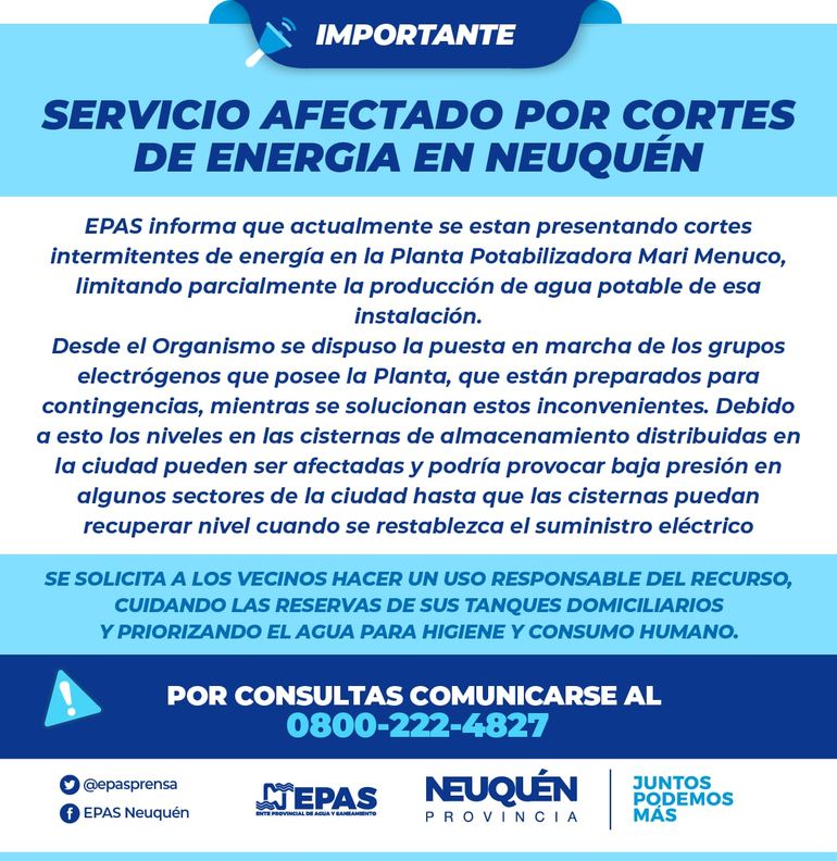 Sin embargo, el gerente general del Ente Provincial de Agua y Saneamiento (EPAS), Esteban Rodríguez, aseguró a LMNeuquén que los problemas fueron solucionados en las últimas horas del viernes por la noche. "Por suerte no hubo más cortes de energía, y durante la madrugada (de este sábado), las cisternas que tenían nivel se pudieron recuperar. Hoy -el servicio- está normalizado", expresó.