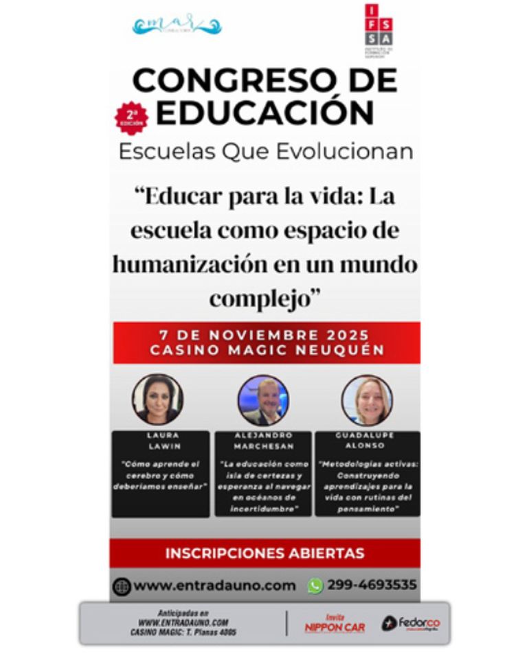 Se desarrollará el 2° Congreso de Educación “Educar para la vida: la escuela como espacio de humanización en un mundo complejo”, de 8 a 16 en el Casino Magic. Organizado por Mar Consultora y el Instituto IFSSA, el encuentro está destinado a docentes, estudiantes y público general. Su objetivo es generar un espacio colectivo de inspiración y aprendizaje que invite a repensar el rol de la escuela desde un enfoque humano y consciente.