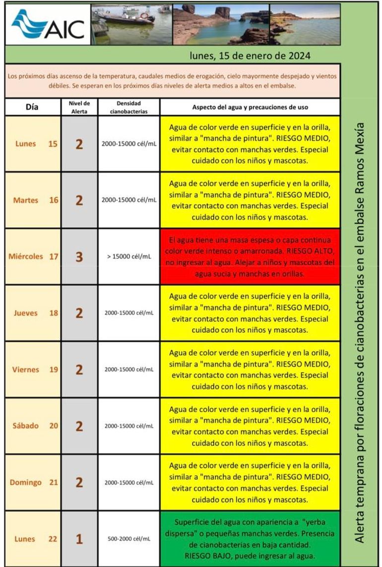 En 2022 la AIC elaboró 30 reportes, en los cuales en la mayor cantidad de días del año el riesgo es bajo o nulo en la floración de algas, y en 2023 difundió 17 reportes.