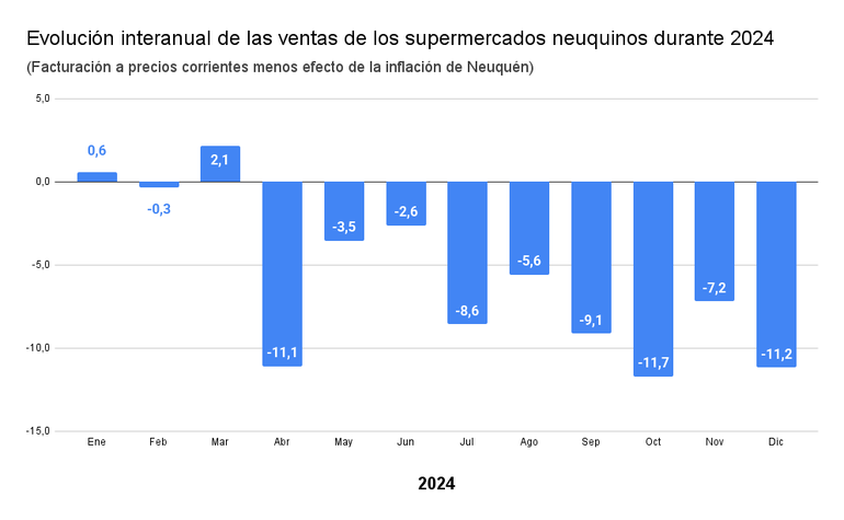 Las ventas de los supermercados neuquinos cayeron casi todos los meses del año pasado respecto al mismo lapso del 2023. En diciembre, la demanda se redujo 11% en términos reales, es decir, descontando la inflación a la facturación corriente, en base a la medición del IPC de la Dirección Provincial de Estadísticas y Censos.