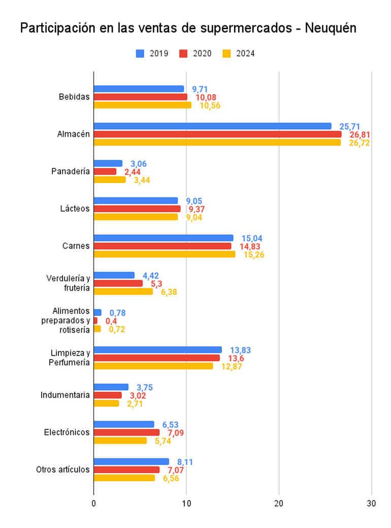 Los rubros almacén, carnes, y limpieza y perfumería explican más de la mitad de la facturación del conjunto de supermercados neuquinos, una posición que mantienen desde antes de que se presentaran las condiciones extraordinarias por la pandemia. El índice de ventas de los supermercados contempla un universo de 68 bocas de expendio desplegadas en el territorio neuquino.