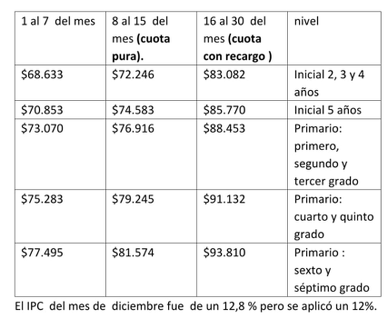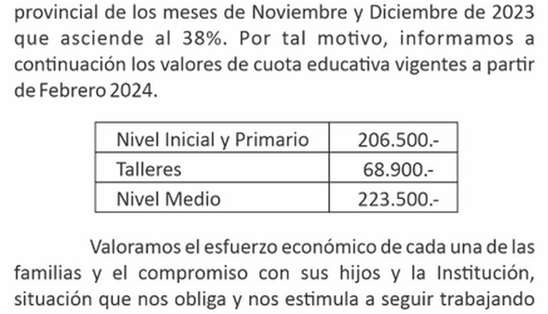 "Ante las reiteradas consultas sobre el valor de la cuota del año entrante y al solo efecto de dar previsibilidad a las familias respecto del monto de la misma, nos dirigimos a ustedes para informarles que la cuota del mes de febrero tendrá un incremento del 24%. Este porcentaje será deducido al porcentaje de aumento de sueldos acordado por el gremio ATEN y el gobierno de la provincia correspondiente al IPC del último trimestre 2023. El resultante de la diferencia se aplicará en la cuota de marzo 2024", informaron los directivos.