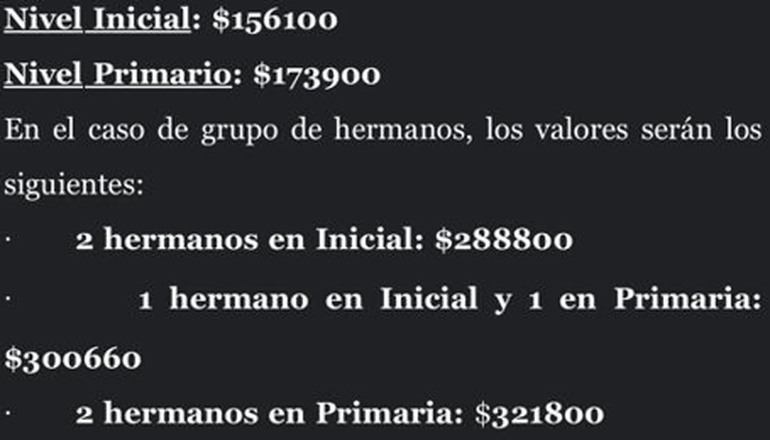 La bonificación por un hermano no llega a los $10.000; y por dos hermanos, de apenas $19.440, en el nivel inicial y primario. La secundaria es un poco más cara, como suele pasar en todos los establecimientos.