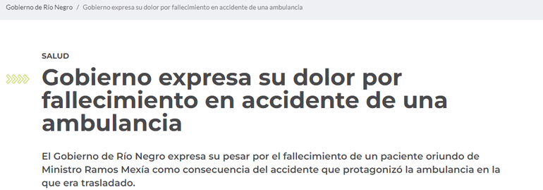 El Gobierno de Río Negro emitió un comunicado en relación al accidente protagonizado por un vehículo hospitalario. Se manifestó que "acompaña a la familia en tan doloroso momento, así como al personal de Salud Pública y a otra paciente que viajaba en el vehículo siniestrado".