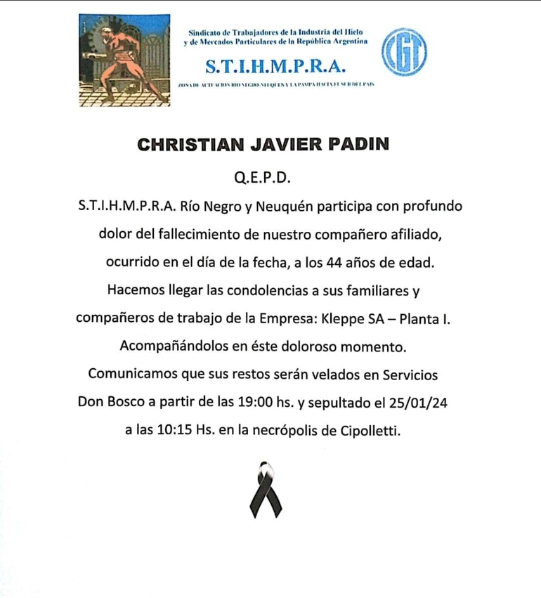 El Sindicato de Trabajadores de la Industria del Hielo y de Mercados Particulares de la Republica Argentina (Sthimpra), lamentó este miércoles el trágico fallecimiento de uno de sus afiliados en la panta de empaque de la firma Kleppe, en Cipolletti. El obrero cayó de un techo y lamentablemente perdió la vida.